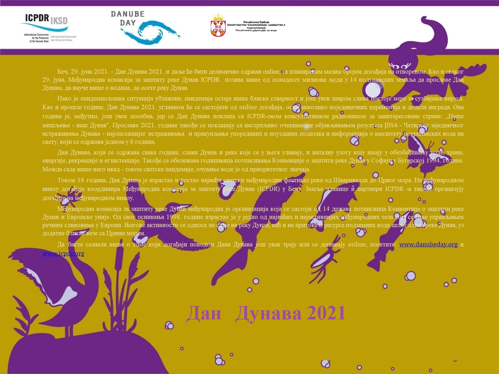 Позивамо све заинтересоване на консултативну радионицу „Наше мишљење – Наш Дунав“, коју организује ICPDR путем апликације Zoom, 29. и 30. јуна 2021. године. Важно нам је мишљење сваког појединца, јер само са активним учешћем свих заинтересованих, јавности и стручњака можемо кроз повратне информације, коментаре, сугестије и конструктивне дискусије доћи до квалитетних предлога планова.
